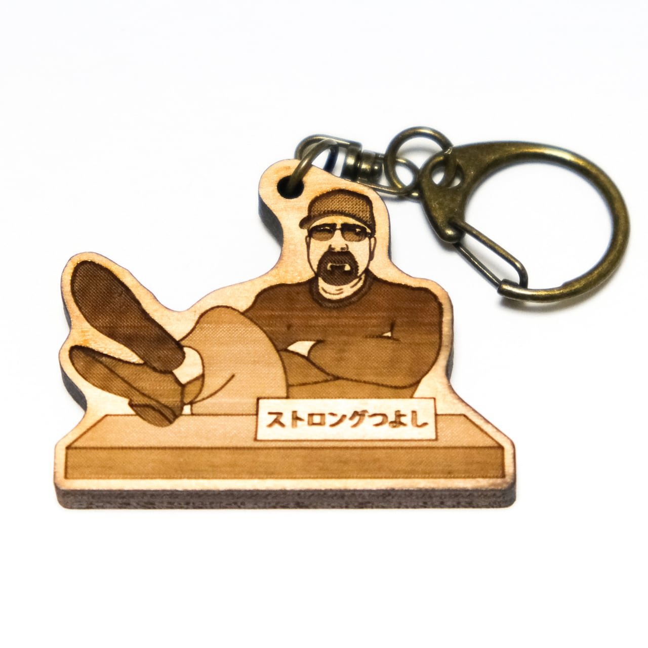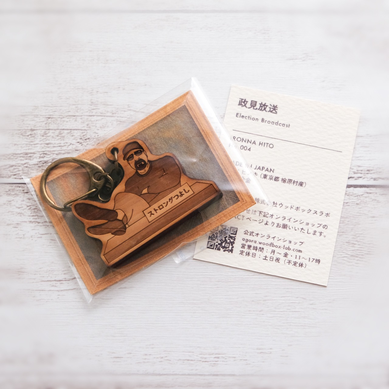 昨今の政見放送に出てきそうな雰囲気の人をモチーフにしたキーホルダーです。